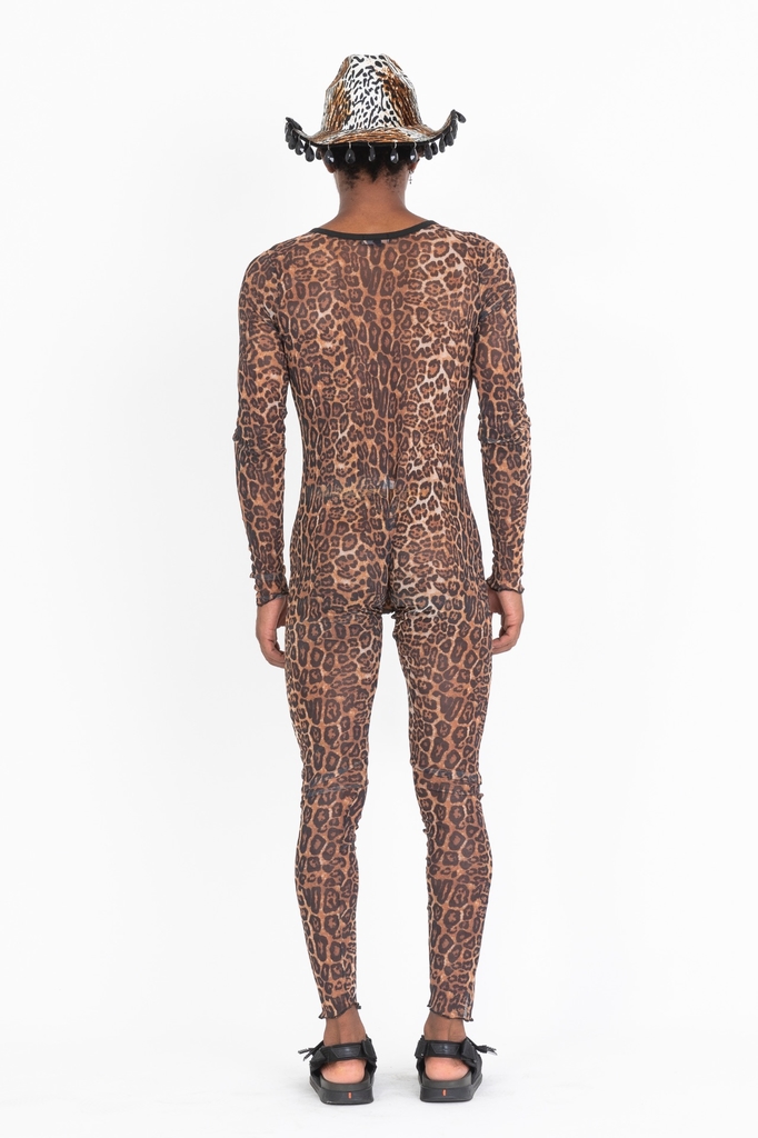 Catsuit em tule estampado com zíper frontal.